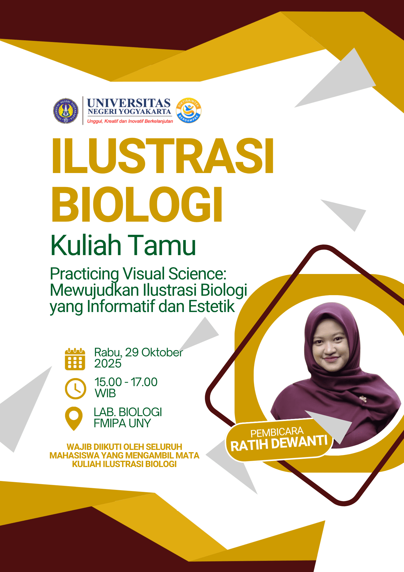 Kuliah Tamu bertajuk “Practicing Visual Science: Mewujudkan Ilustrasi Biologi yang Informatif dan Estetik” pada Rabu, 22 dan 29 Oktober 2025 telah diselenggarakan Program Studi Pendidikan Biologi, FMIPA UNY. Kegiatan ini menghadirkan Ratih Dewanti, seorang ilustrator sains yang aktif berkarya dalam bidang visualisasi ilmiah untuk publikasi, pembelajaran, dan media edukasi.
